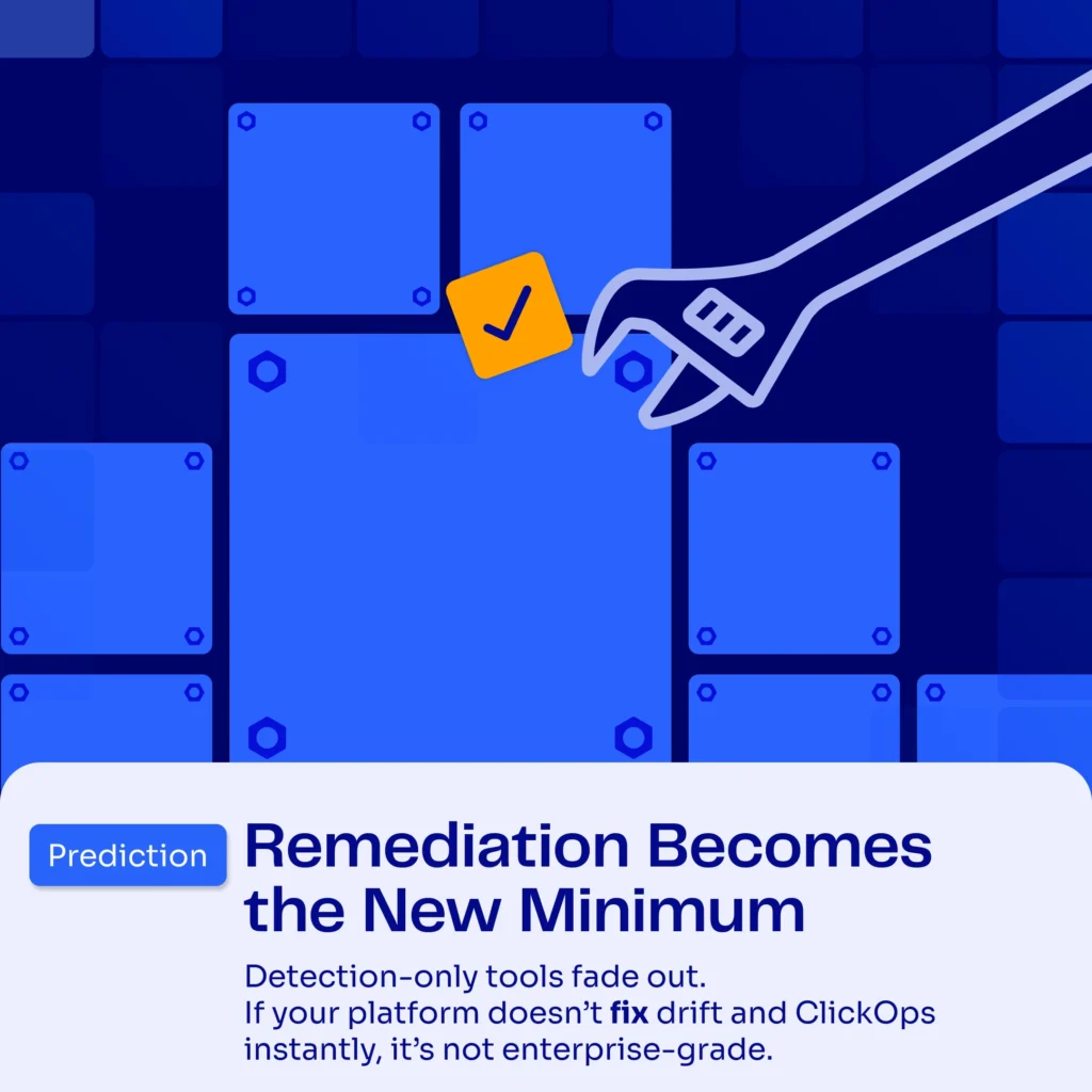 Platforms will be expected to automatically correct drift, reverse unauthorized console changes, and maintain desired state continuously. Remediation engines will grow far more context-aware (understanding dependencies, policies, and intent) and acting on them without waiting for human approval.