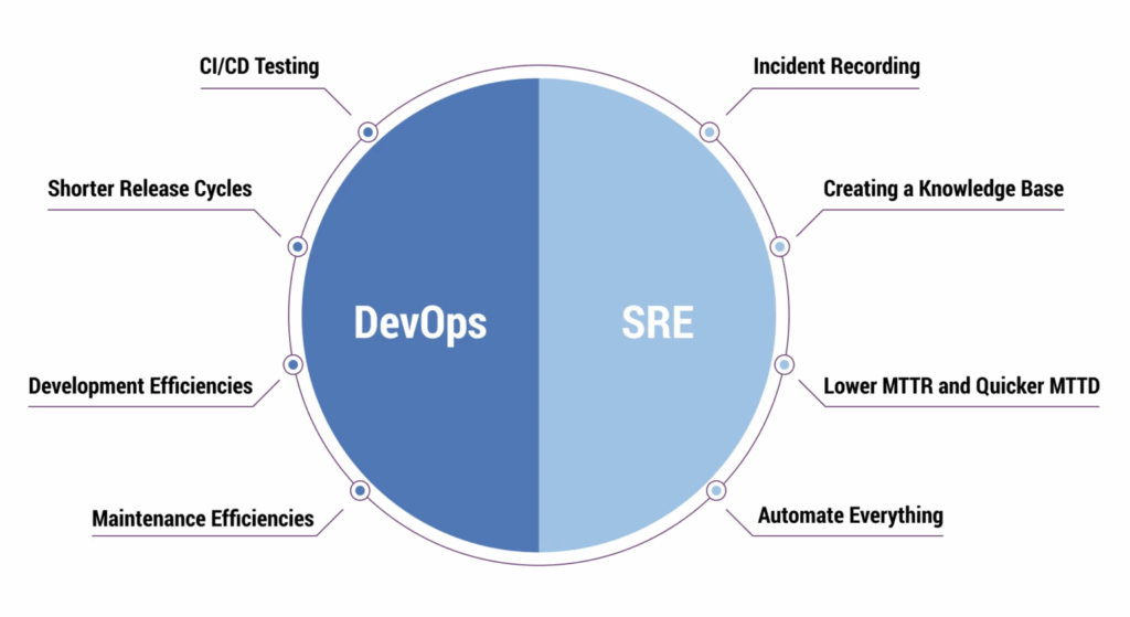 SRE | Reliability, uptime, performance | Uses engineering to solve ops problems focusing on reliability-first |