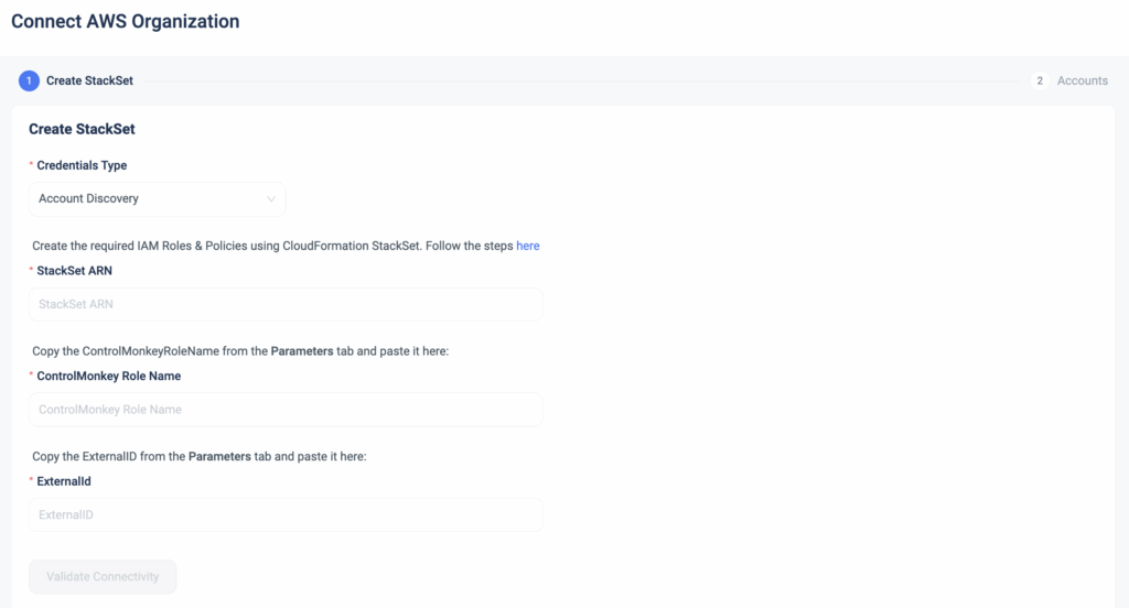 The StackSet in your parent (organization) account will generate an IAM Role and IAM Policy (which enable the connection to the ControlMonkey platform) in the organizational units and accounts you choose to opt-in.