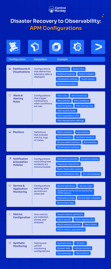 Yet the configurations behind these systems – dashboards, alert policies, monitors, and escalation rules – are rarely protected by disaster recovery.