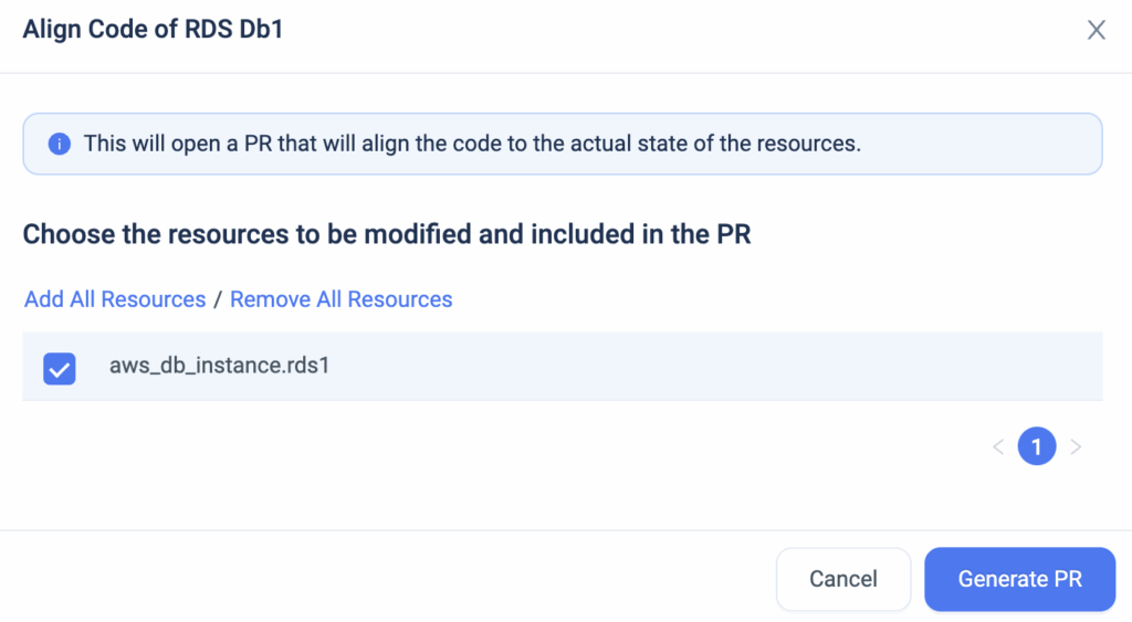 In cases where you are certain that the running configuration is the right one, you can use this remediation action to align your Terraform code to what’s running in production.