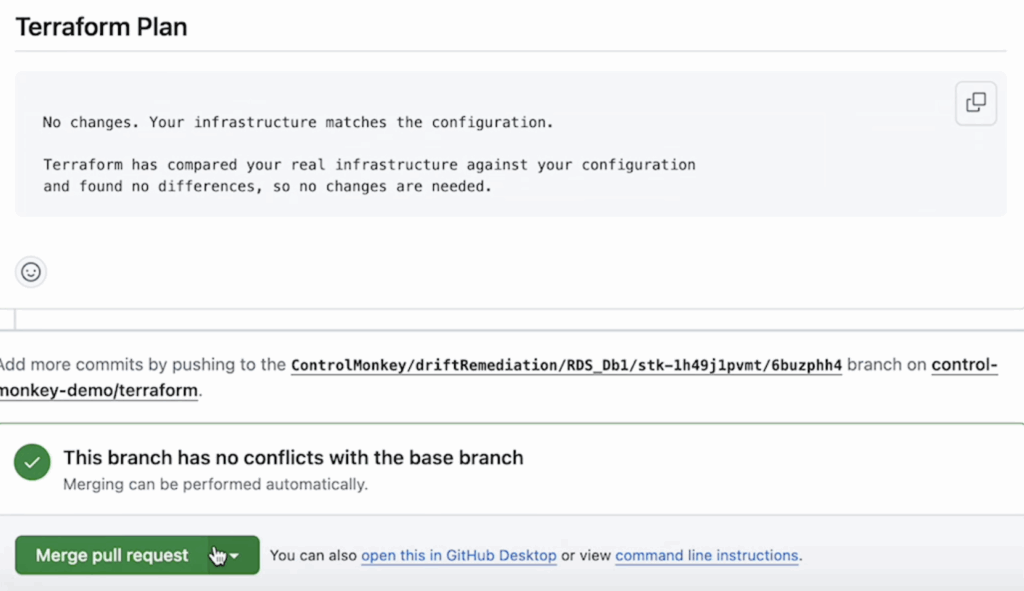 As part of our Terraform CI/CD pipeline, whenever a new PR is created, we automatically start a ‘Terraform Plan’ to the branch of the stack. After the Terraform Plan is completed and the drift is resolved, you can then merge the PR to your main branch.