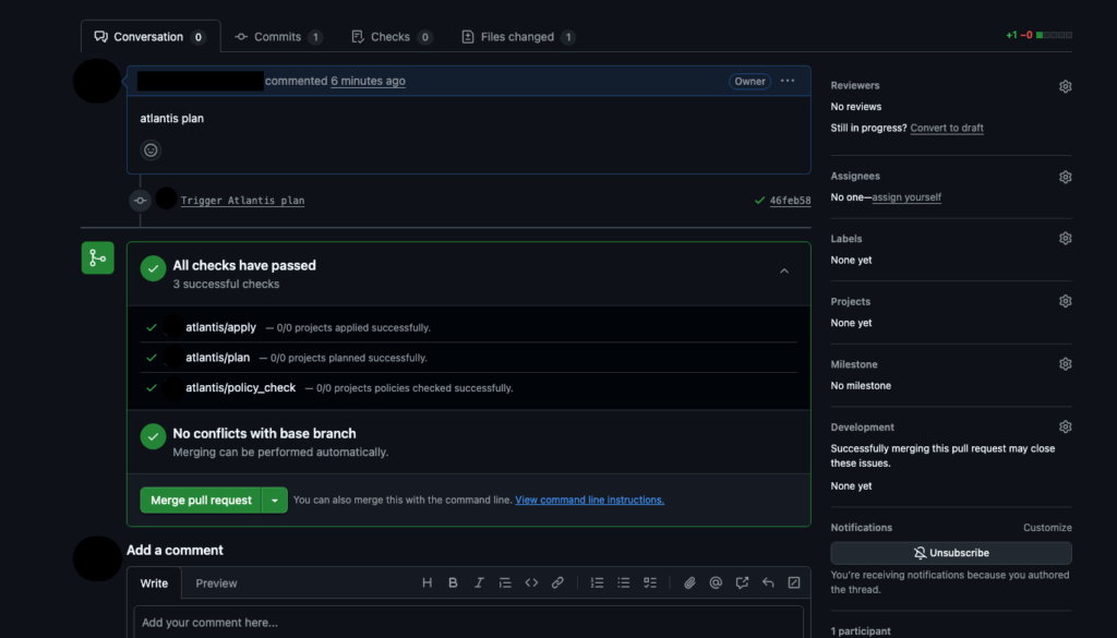 While Atlantis automatically runs the Terraform plan, when a pull request is created, developers can also manually trigger a plan by adding a comment in the pull request. This is extremely useful when additional commits are pushed to a branch after the initial plan, or re-validating infrastructure changes before approval.