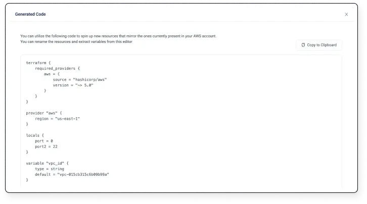 - One-click Terraform code generation & import that lets you convert existing resources into clean, maintainable Terraform configuration files and state in minutes instead of months of manual work.