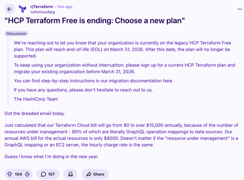 Apart from this, many users are unhappy about the end of the HCP Terraform Free plan, with one noting that they calculated their Terraform Cloud bill will go from $0 to $15,000+ annually due to the number of resources under management.