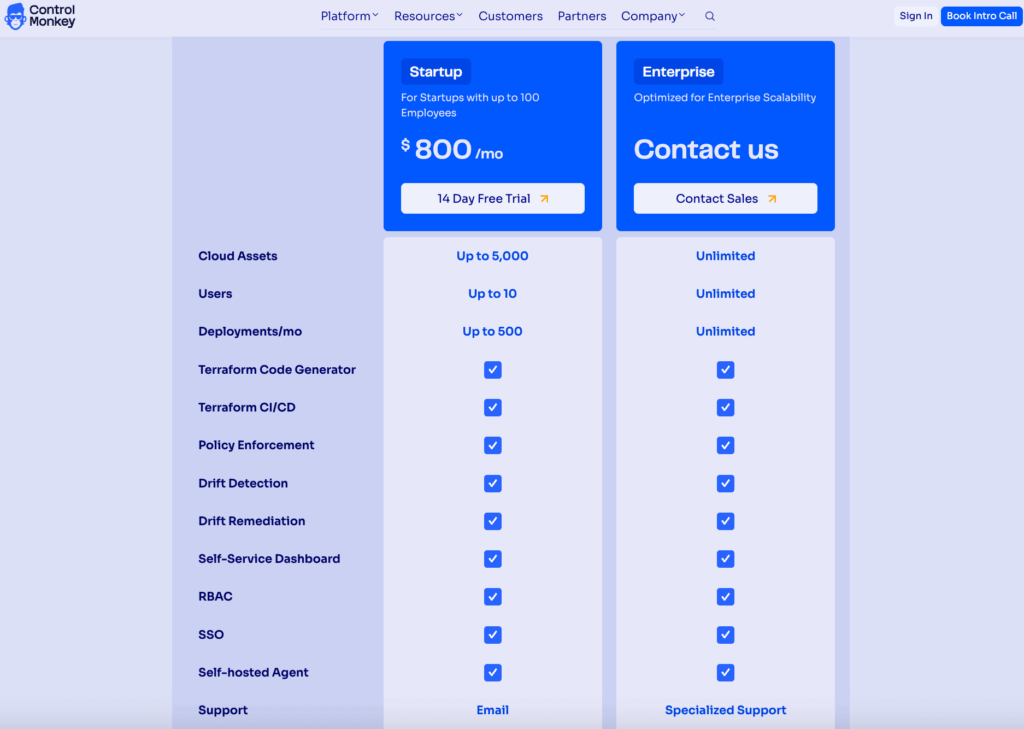 - Startup: $800 for up to 10 users, up to 5,000 cloud assets, up to 500 deployments/month, and access to our Terraform code generator, Terraform CI/CD, policy enforcement, drift detection and remediation capabilities, self-service dashboard, RBAC, and self-hosted agent.