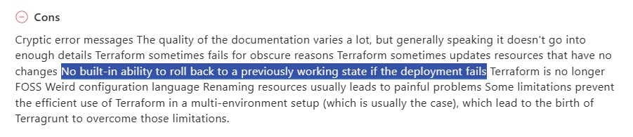 Unlike some other Hashicorp Terraform Cloud alternatives on the market, the platform doesn’t give you a native, simple “rollback to last known good state” button.