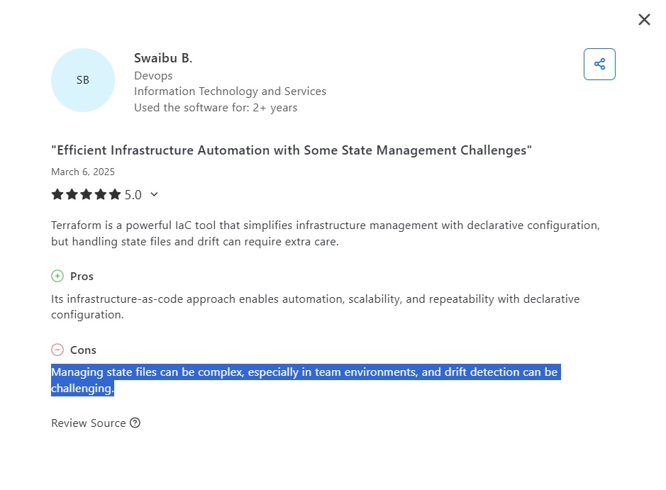 ‘’Managing state files can be complex, especially in team environments, and drift detection can be challenging.’’ – Capterra Review.